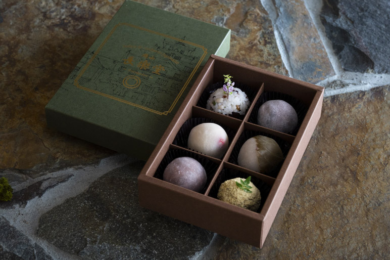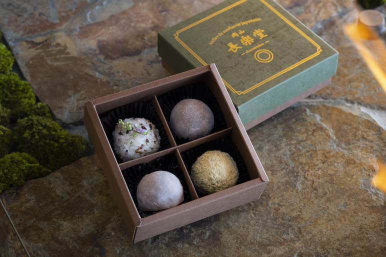 求肥には県産の黒米と滋賀県産羽二重粉を使用しております。